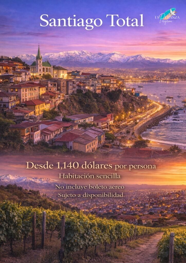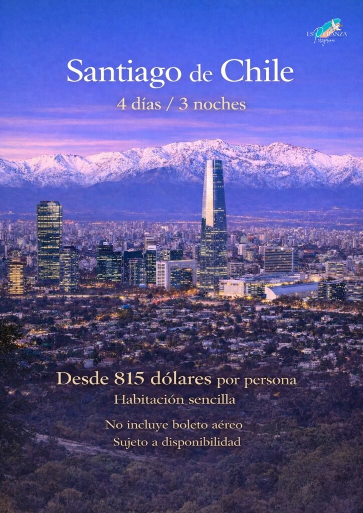 5 días y 4 noches visitando la ciudad, desayunos incluidos, alojamiento, transporte privado, medio día de City Tour Santiago Panorámico, Alyan Sunset Experience, dia completo en Valparaíso y Viña del Mar (almuerzo incluido), medio día en viñedos del Maipo y mucho más. Personaliza el tuyo.
